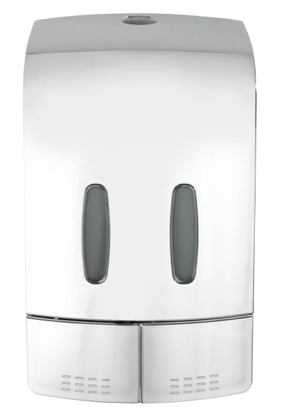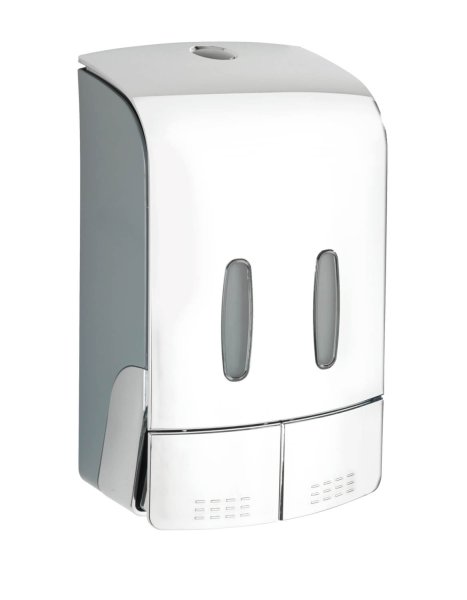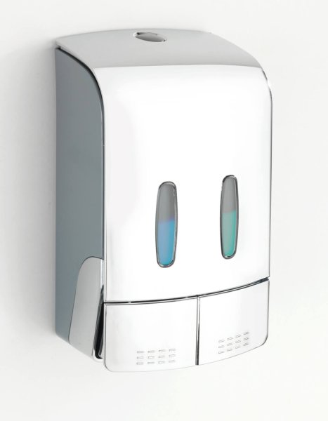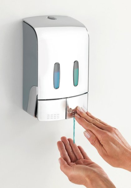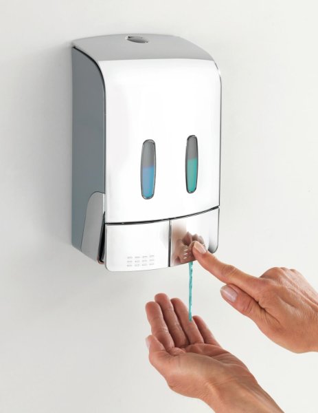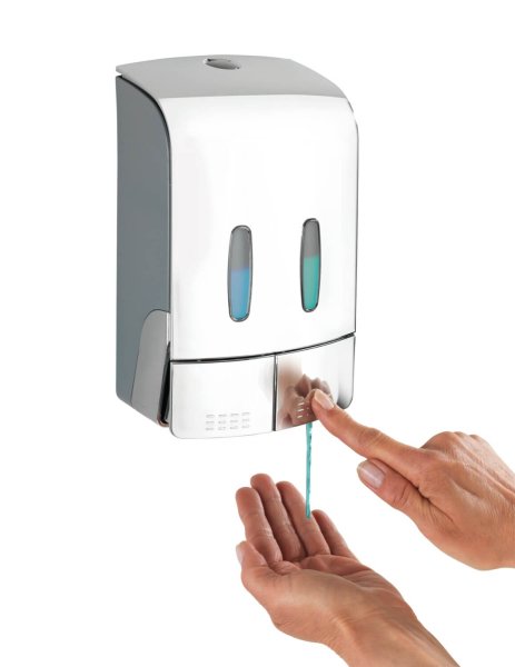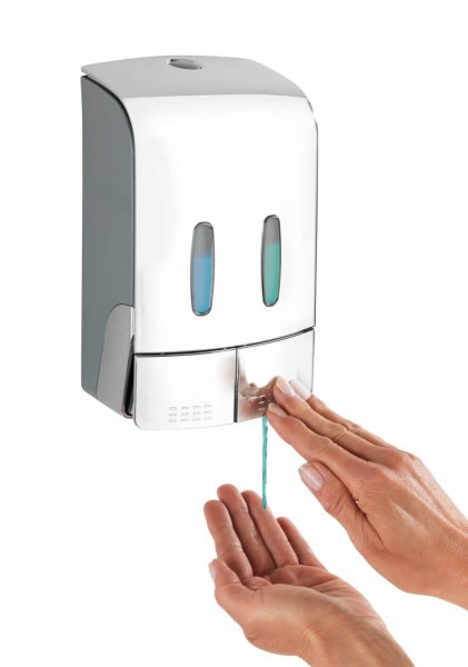 Požadované množství se vydá jednoduše stisknutím tlačítka. Obě komory lze naplnit jednotlivě až do 480 ml, takže do jedné komory lze napustit například dezinfekční prostředek a do druhé mýdlo. To poskytuje dvojí funkci v jednom dávkovači.