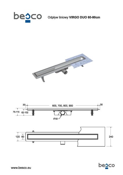 Odtokový žlab VIRGO DUO- 90: délka roštu 90 cm, délka žlabu 96 cm