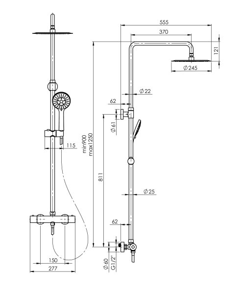 - Regulovatelná výška hlavové sprchy 779 - 1250 mm