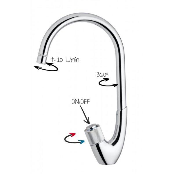 Dřezová stojánková vodovodní baterie SWAN-33 vyniká vysoce kvalitním zpracováním a spolehlivou funkčností všech součástí a materiálů.