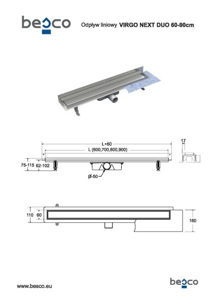 Odtokový žlab VIRGO NEXT DUO- 60: délka roštu 60 cm, délka žlabu 66 cm