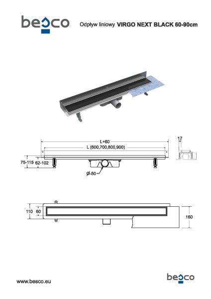 Odtokový žlab VIRGO NEXT BLACK- 60: délka roštu 60 cm, délka žlabu 66 cm