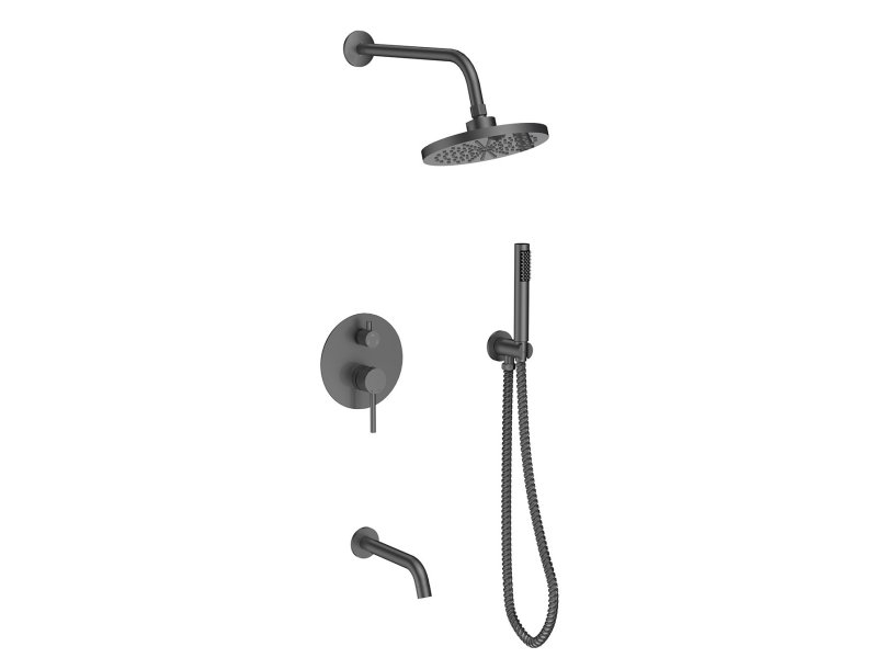 - Set obsahuje podomítkovou baterii, vývod ze stěny s držákem, včetně ruční sprchy a hadice, dále držák a kulatou hlavovou sprchu a stěnový vývod