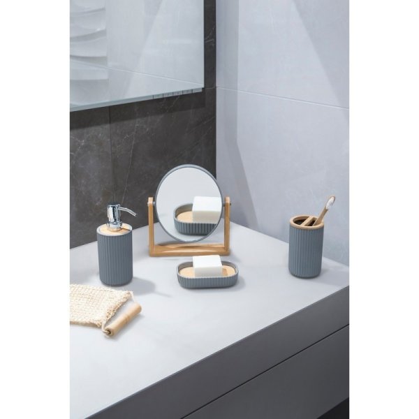 Sérii RAYAON je tvořena kelímkem na zubní kartáčky, mýdelníkem, WC štětkou, kosmetickým zrcátkem a dávkovačem mýdla.