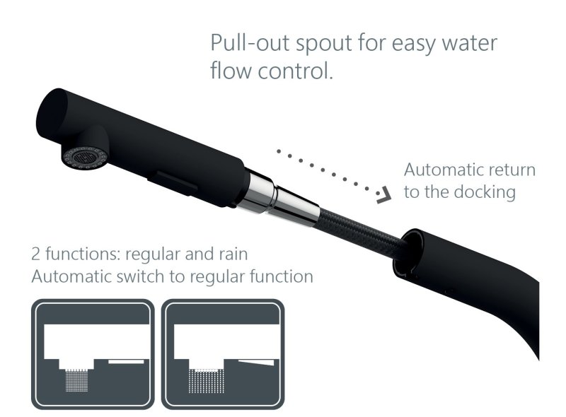 - Výsuvná 2-polohová sprška vám nabízí vysokou flexibilitu při čištění pánví, hrnců a každého rohu dřezu. Díky velkému rozsahu pohybu můžete bez omezení plnit nádoby jakéhokoli typu a velikosti.