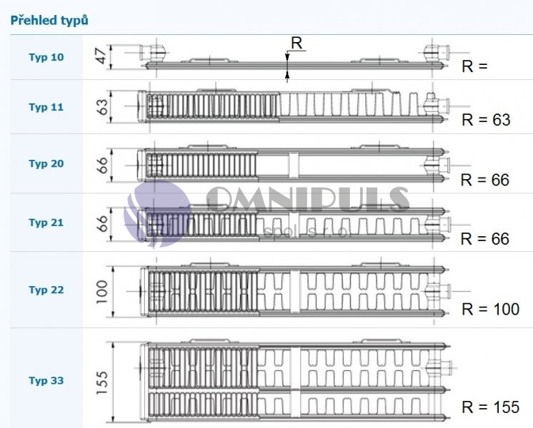 přehled typů deskových radiátorů Korado (do poznámky uvést hloubku radiátoru)
