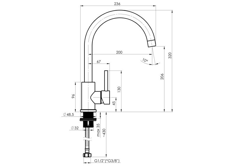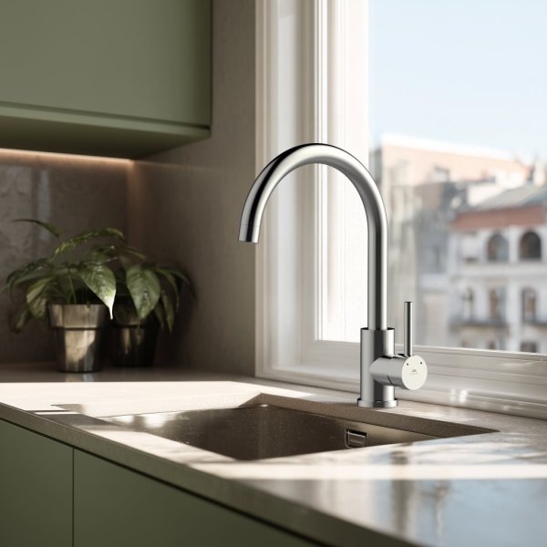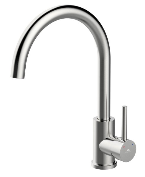Dřezová stojánková vodovodní baterie SWAN-33 Nerez s atraktivním obloukovým výtokovým ramenem podtrhne moderní design každé kuchyně. Baterie je unikátní svým tlačítkem pro spuštění a zastavení proudu.